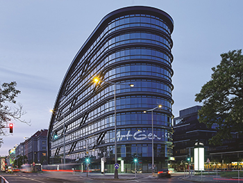This curtain wall can be custom-designed – as seen in the bespoke system used in the office complex and art space in Prague, ArtGen.