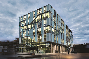 A key part of the city’s regeneration, the building is based on an old bank, but only retains the original concrete structure. As part of the concept, three different types of glass make up the façade with clear and green glass and a third white glass panel positioned approximately 12cm further forward. This gives a sense of greater depth to the curtain wall, which covers an area of 2,700m2.