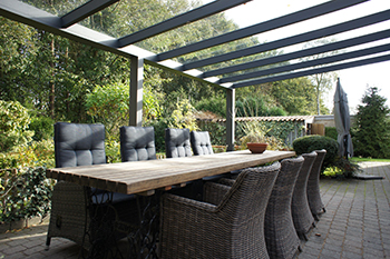The Luminia Veranda has features like invisible fixings, water drainage pipes within the posts, adjustable roof pitches, optimised aluminium reinforcement and cable-free LED lighting in the rafters.